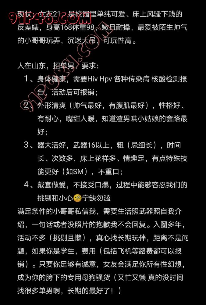 山东区域招优质单男,要求详见照片,不满足要求的勿扰!计划暑假期间约,女友QQ开通,通过筛选的可以加Q聊,欢迎撩骚技能加满的帅哥骚扰!